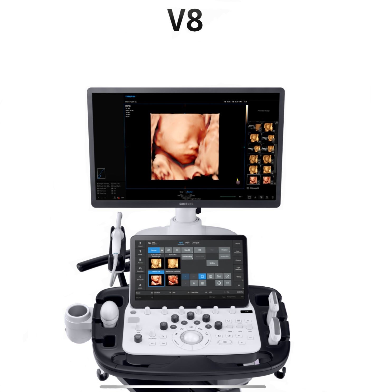 The Samsung V8 is powered by Crystal Architecture™, which combines CrystalBeam™ and CrystalLive™ for exceptional image resolution. It also includes advanced color processing and Dynamic Color Responsiveness, ensuring high-quality images across a variety of clinical applications.